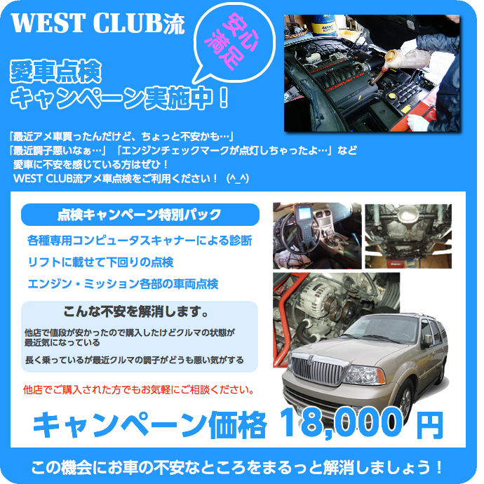 アメ車の整備・部品交換・修理・車検のことならアメ車専門店ウエストクラブにすべてお任せください。豊富な実績でアナタの愛車に最適の方法で問題を解決します。
